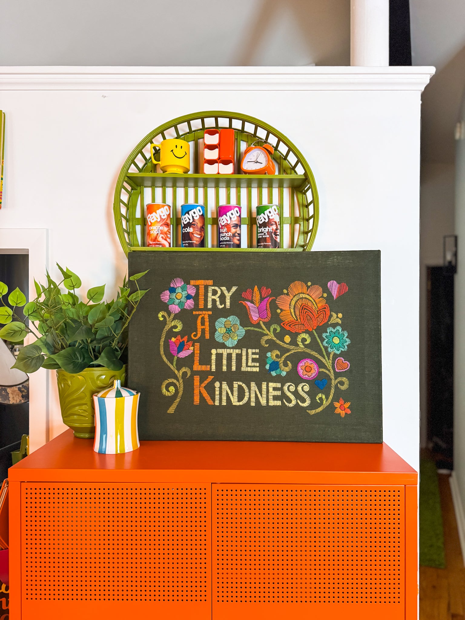 This new embroidery crewel is a replica of the classic 'Talk A Little Kindness' crewel. Uplifted by the bold primary colors against a green cotton background, it is a reimagined version of the vintage piece, handmade with care.