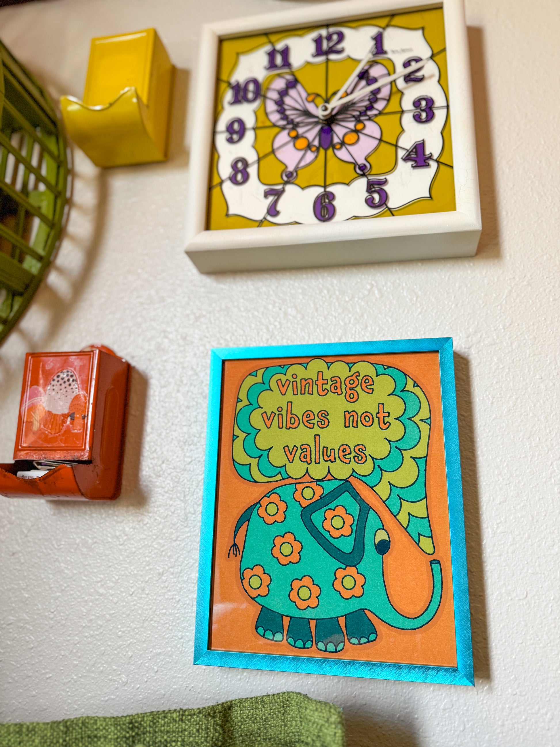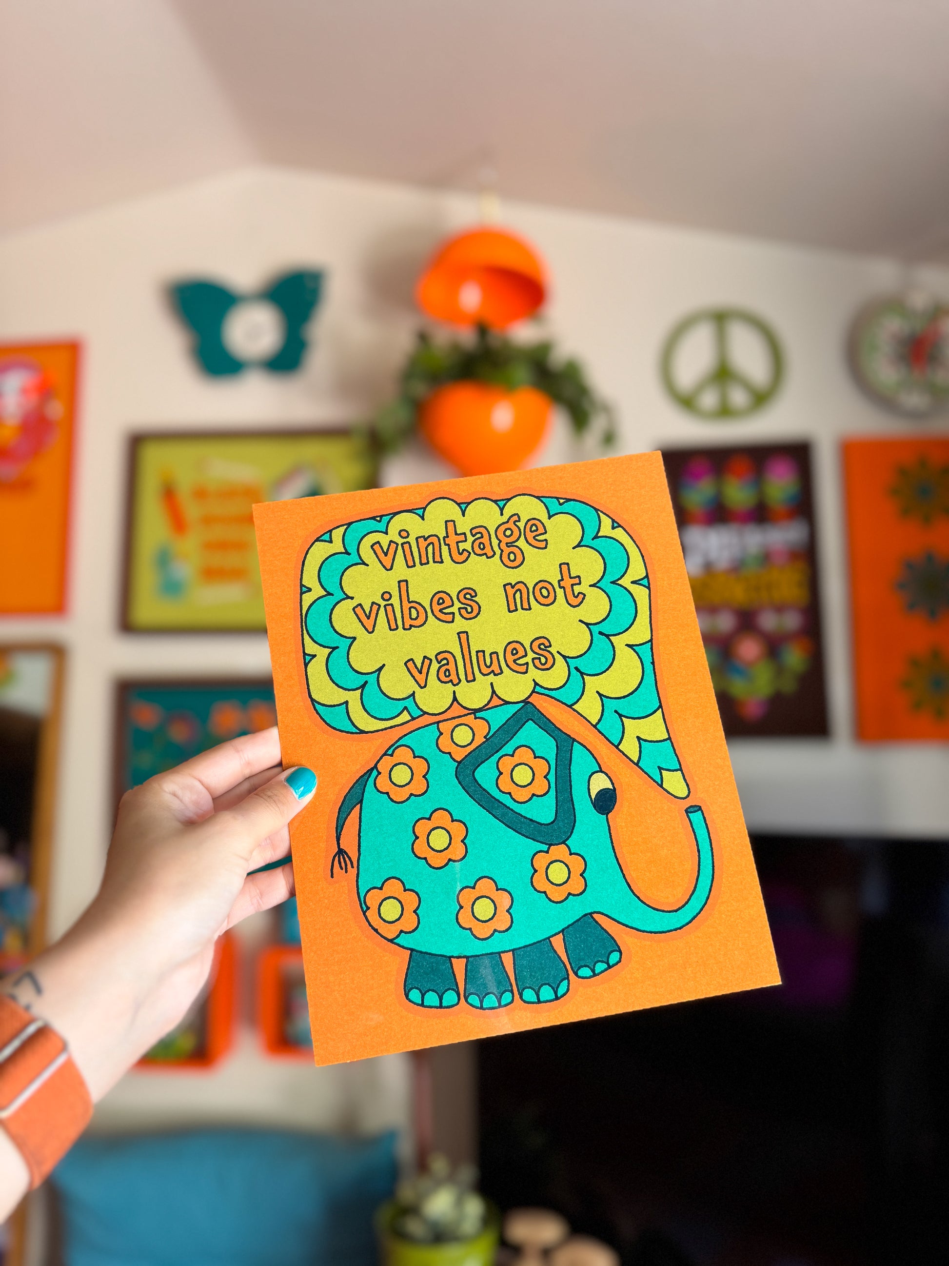 Add a pop of 70s-inspired charm to your space with this vibrant ‘Vintage Vibes Not Values’ metal sign! Featuring an original retro illustration of a groovy flower power elephant, this bold wall art combines vintage style with a modern message — perfect for anyone who loves nostalgic decor with meaning.